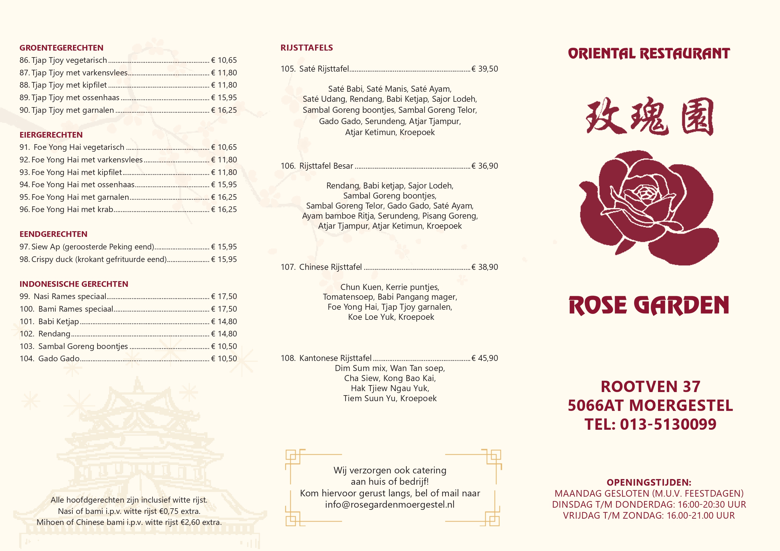 In het hart van het gemoedelijke dorp Moergestel verwelkomen we u bij Rose Garden, uw favoriete bestemming voor heerlijk Chinees eten. Na onze vestiging in Oisterwijk, zijn we verhuisd naar het hart van Moergestel. Op slechts 100 meter afstand van het gezellige centrum, bieden we goede parkeergelegenheid, heerlijke gerechten en een warme gastvrijheid. Ontdek ons uitgebreide menu met meer dan honderden gerechten en diverse rijsttafels.
